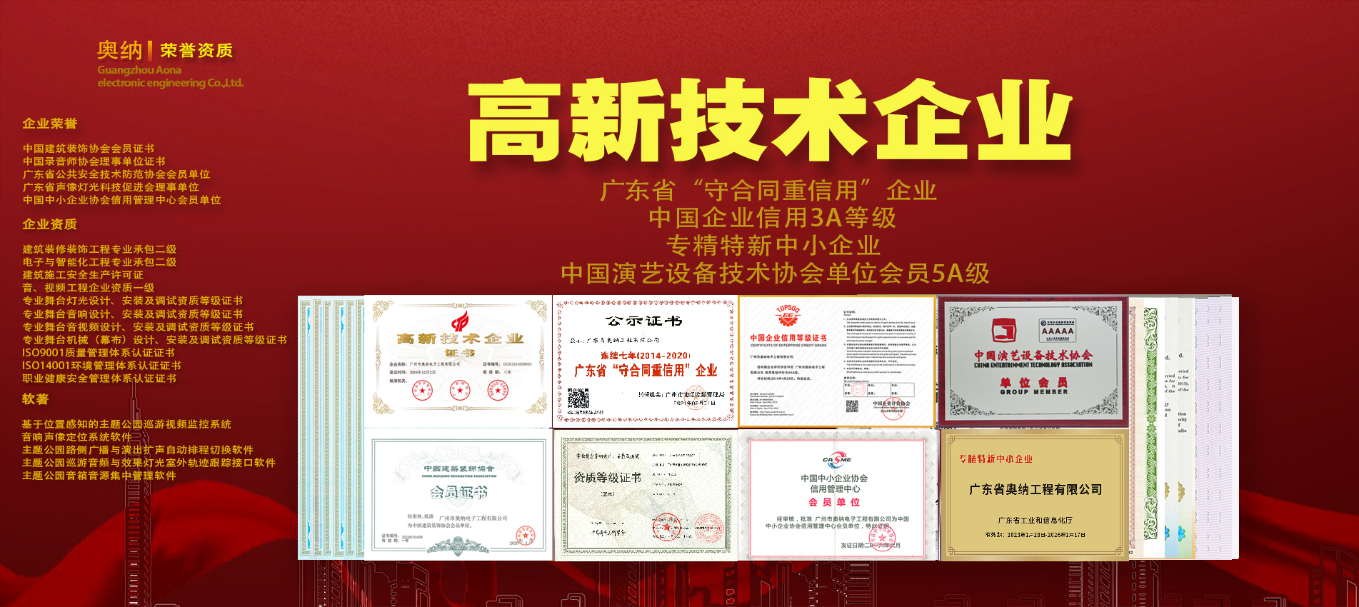 公司現(xiàn)擁有多項資質證書,獲得專利和軟著近百項,并先后榮獲百強工程商、優(yōu)秀文旅演藝獎等獎項,在科學化、標準化、規(guī)范化方面深得客戶信賴。公司參與建設的“華南理工大學國際校區(qū)圖書館”榮獲2022-2023年度中國建設工程魯班獎。